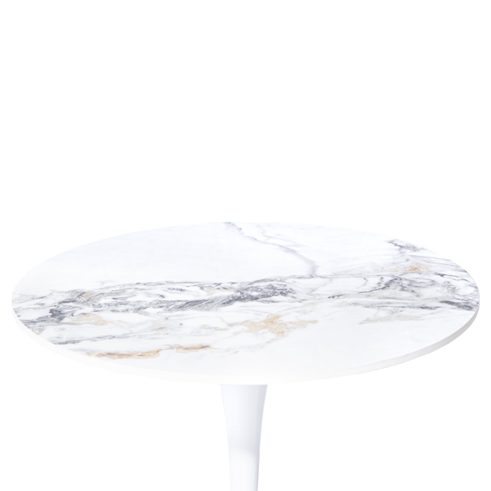Produzida com tampo em MDF em Mármore Artificial, a mesa oferece um acabamento refinado, resistente e fácil de limpar, mantendo sua beleza e uniformidade por muito mais tempo. A base em aço pintado complementa a peça com estabilidade e firmeza, reforçando o charme icônico do design tulipa e garantindo durabilidade no uso diário.